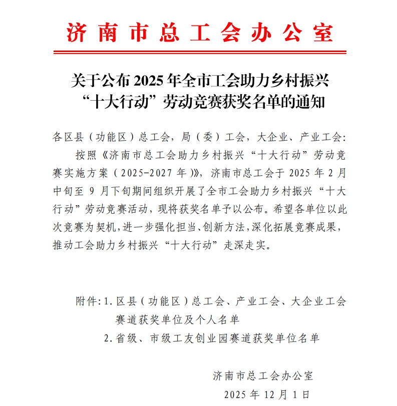 近日,2025年全市工會助力鄉(xiāng)村振興“十大行動”勞動競賽獲獎名單正式公布,濟南長田實業(yè)有限公司成功斬獲省級、市級工友創(chuàng)業(yè)園賽道一等獎。